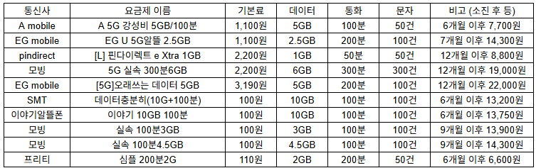 | 이야기알뜰폰 | 이야기 10GB 100분 | 100원 | 10GB | 100분 | 100건 | 6개월 이후 13,750원 |